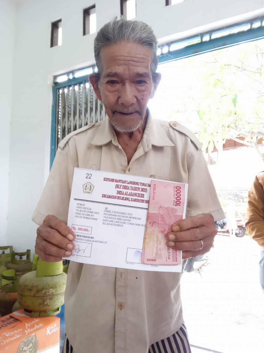 Kamis, 6 November 2025 — Pemerintah Desa Alasangker kembali menyalurkan Bantuan Langsung Tunai (BLT) yang bersumber dari Dana Desa untuk bulan November 2025 kepada 32 KPM. Kegiatan penyaluran berlangsung di Bumdes Giri Amerta dengan tetap mengedepankan prinsip transparansi dan tepat sasaran.